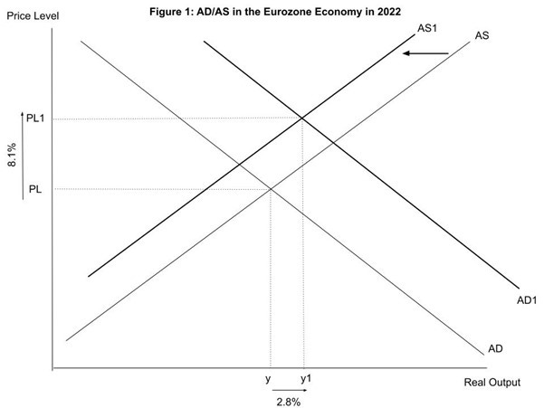 The inflation could be demand-pull, caused by changes in components of aggregate demand (AD); or cost-push, caused by the increase in energy prices – caused by supply chain issues resulting from the 2022 Russo-Ukrainian War – being passed onto the consumer. It is concurrent with rising food and energy costs; this, and the recency of the supply-side issues, suggests that this is cost-push inflation. But though growth forecasts for 2022 have been cut, output has not fallen in the eurozone – it has risen by 2.8%, shown in the shift from y to y1 on Figure 1. This suggests that although AS has decreased to AS1, because of those factors, AD has increased more than AS decreased, to AD1. This led to 8.1% inflation – from PL to PL1.