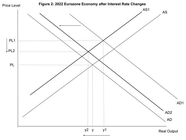 Assuming ceteris paribus, aggregate supply remains at AS1. It is impossible to ascertain how much AD will decrease following the proposed change, but it is improbable that it will return to precisely its original level, as the ECB have imperfect information with respect to precisely how consumers and businesses will respond. Nevertheless, Figure 2 shows that this policy might alleviate inflation without countering it wholly, and simultaneously cause a fall in Real Output to y2. On this diagram, if AD decreases enough for prices to return to their original levels, this will fall even further, potentially leading to a recession.